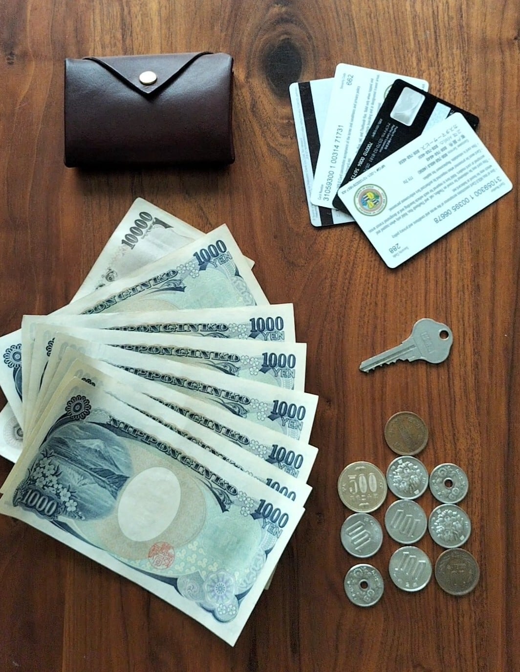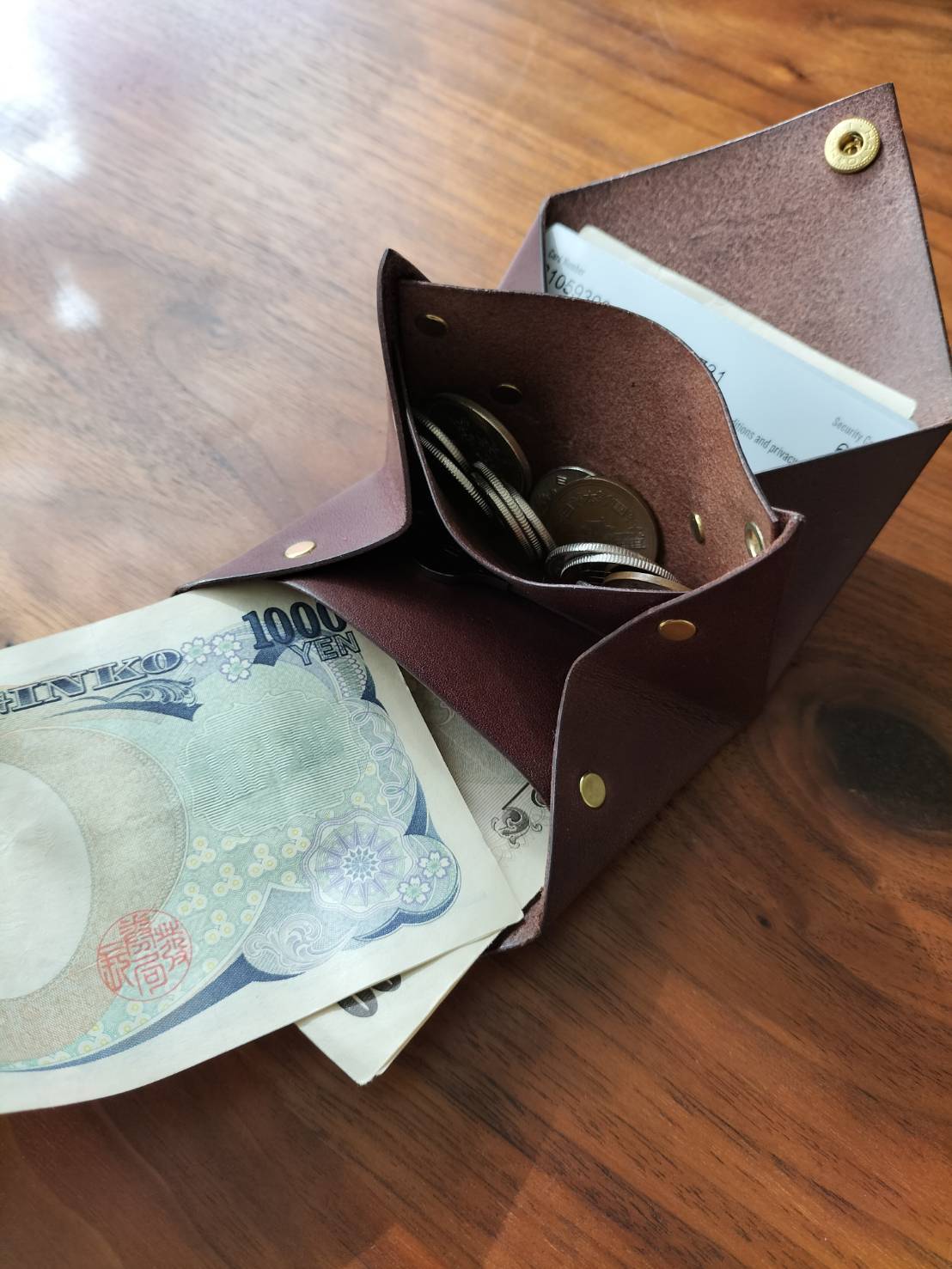 収納量は、お札は約8枚、小銭は約10枚、カードは約4枚入れることができます。
